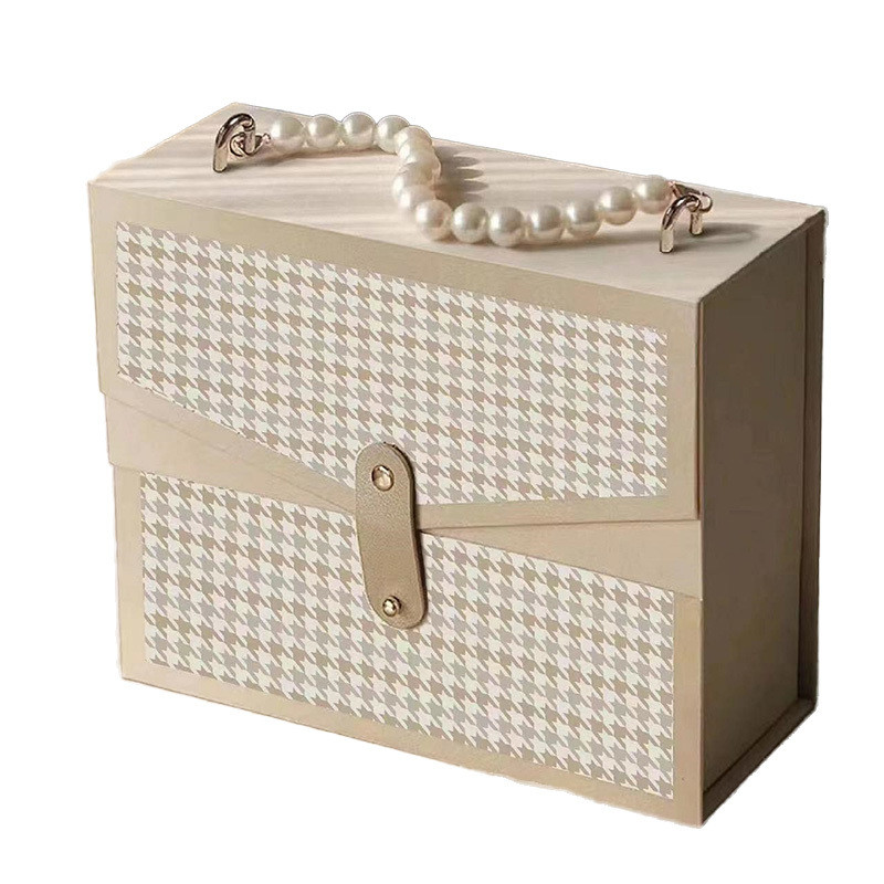 The Valentine's Day double-door pearl hand-held gift box with houndstooth design and high-end lady box packaging offers several functional benefits: